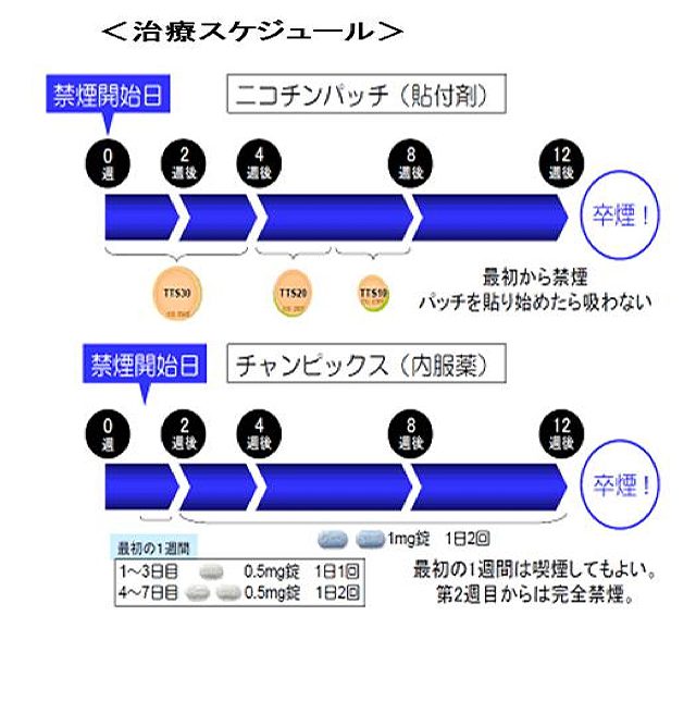 健康保険を使用しての禁煙治療には、内服による方法(チャンピックス内服)もしくは貼付剤による方法(ニコチネルTTS)があります。当院では、問診の上、双方の具体的な説明と、どちらが適しているかなどの具体的な説明をして、治療を開始させていただきます。